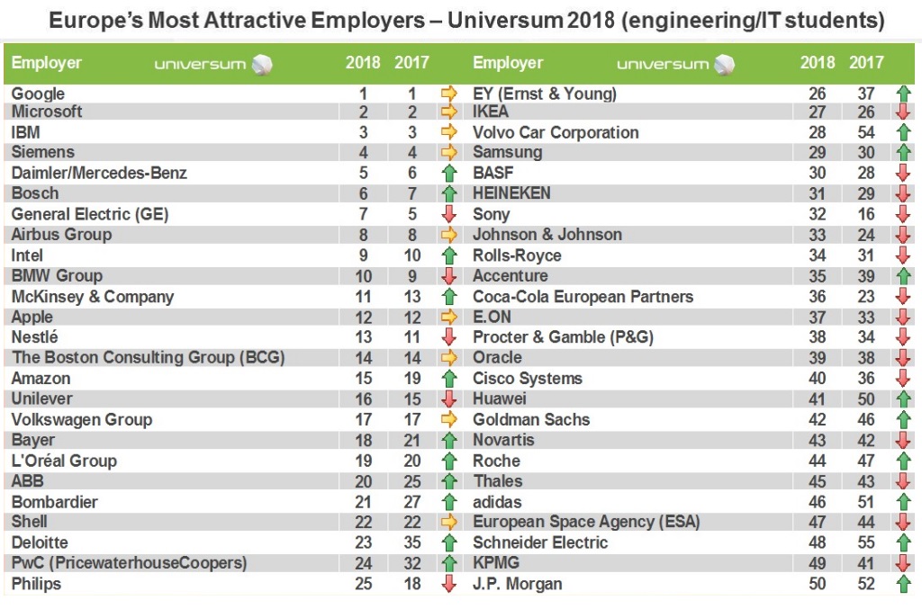 En el ranking de empresas según los estudiantes de ingeniería e informática avanzan también de forma considerable Deloitte (12 posiciones), EY (11 posiciones), Huawei (9 posiciones), PwC (8 posiciones), Bombardier (6 posiciones), ABB (5 posiciones), Amazon y Accenture (4 posiciones). Volvo Car Corporation debuta por primera vez en el top 50 europeo según ambos colectivos, mientras que Schneider Electric, J.P. Morgan, y adidas lo hacen en el ranking según los perfiles técnicos.