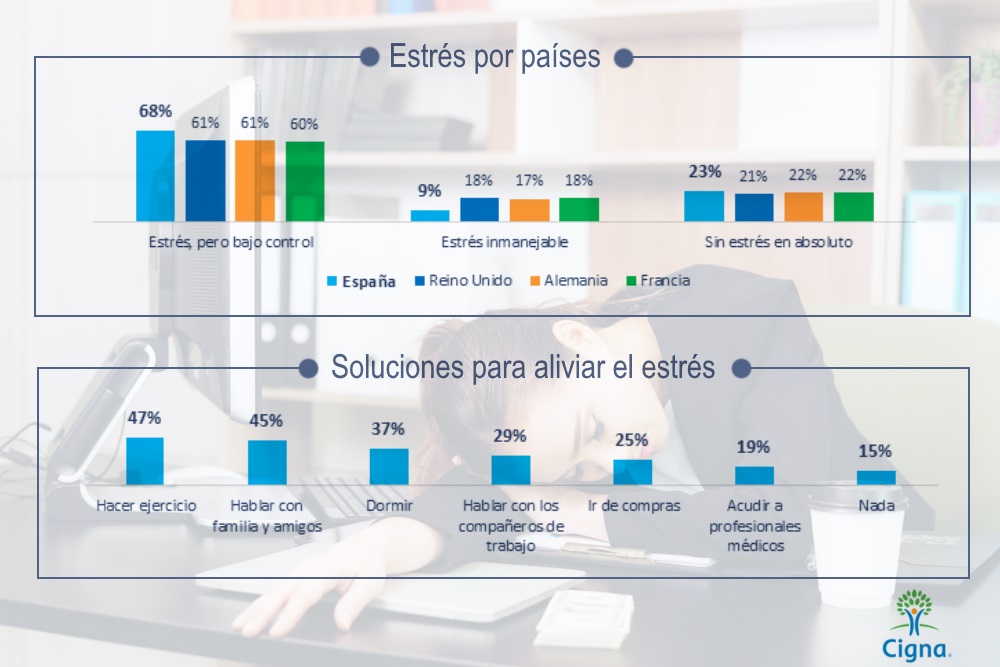 No obstante, a pesar de que la cifra española es alta, el 68% de los encuestados afirma que se trata de una situación que mantiene bajo control. Por contra, solo el 9% de los encuestados reconoce que sus niveles de estrés le hace estar al límite, porcentaje que aleja a España de otros países europeos como Reino Unido, con un 18% de la población con niveles de estrés inmanejables, Francia (18%) o Alemania (17%). De hecho, según el estudio de Cigna "España es uno de los países menos estresados a nivel mundial".