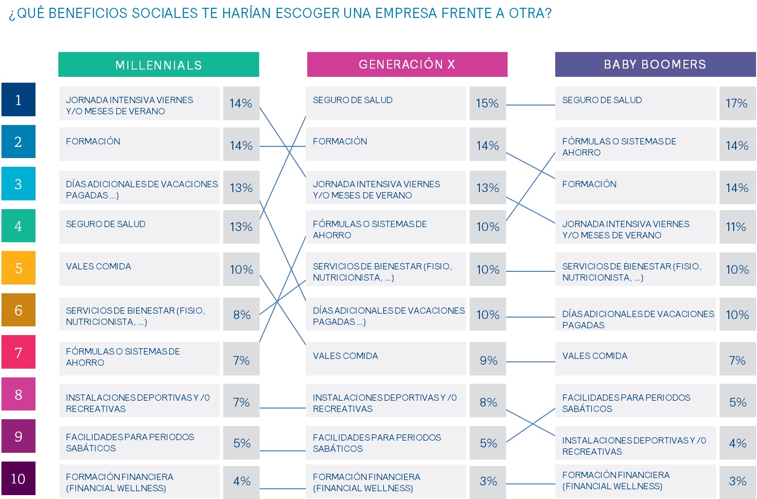 En esta línea, al analizar los beneficios que cada generación considera clave para escoger una empresa u otra, el patrón anterior se repite. Así, según los datos publicados por Mercer, para los Millenials la primera opción sería la jornada intensiva (viernes, verano) y la tercera disponer de días adicionales de vacaciones pagadas. En cambio, para la Generación X y los Baby Boomers estas opciones bajan hasta la tercera y cuarta posición respectivamente en el caso de la jornada intensiva y a la sexta en el caso de los días de vacaciones pagadas.