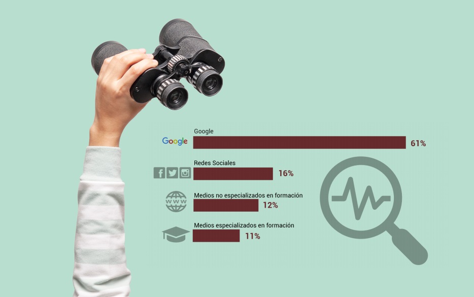 Y ¿cuáles son las herramientas más comunes para buscar este tipo de formación? Según Business School, 6 de cada 10 españoles destacan Google, frente al 12% que lo hace en medios no especializados y el 11% que busca en medios y blogs especializados en temas de formación.