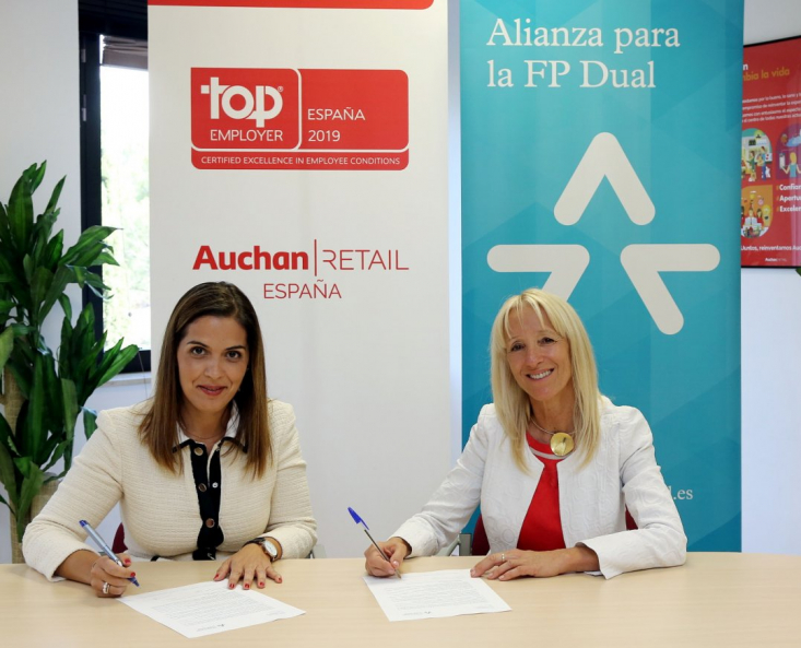 Patricia González, Directora de Recursos Humanos de Auchan Retail España, junto con Clara Bassols, Directora de la Fundación Bertelsmann, han firmado en el centro de formación de la organización, su adhesión la Alianza para la FP Dual con el objetivo de potenciar la Formación Profesional Dual en la empresa e impulsar nuevos proyectos de esta modalidad formativa.