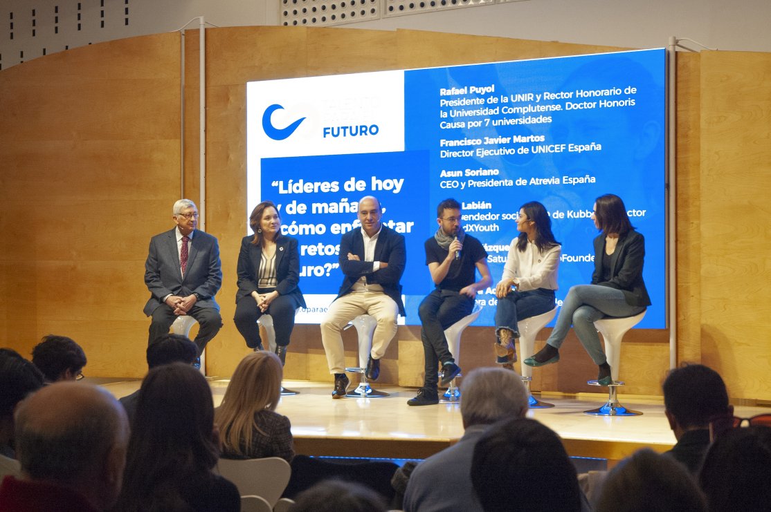 En el evento tuvo lugar, además, un diálogo intergeneracional entre líderes a través de un panel de debate titulado: “Líderes de hoy y de mañana, ¿cómo enfrentar los retos del futuro?”, en el que tres líderes de diferentes ámbitos (Rafael Puyol, presidente de la UNIR y Rector Honorario de la Universidad Complutense; Francisco Javier Martos, Director Ejecutivo de UNICEF España; y Asun Soriano, CEO y presidenta de Atrevia España) han conversado con tres jóvenes destacados (Kike Labián, emprendedor social, CEO de Kubbo y Director de TedXYouth; Carmen Vázquez de Castro, CoLead de Saturdays.AI y CoFounder de Start Universe; y Alejandra Costa, fundadora de Break the Silence) sobre los retos económicos y sociales y cómo construir el futuro común.