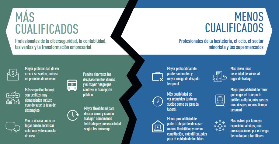 Todos los profesionales están de acuerdo en lo que quieren para el futuro: mantener su empleo, no enfermar, aprender y seguir formándose y no volver a la antigua forma de trabajar. Sin embargo, un análisis más detenido revela que es probable que aumente la desigualdad entre los diferentes tipos de profesionales. Aquellos con las habilidades más demandadas podrán aspirar a una subida salarial, al teletrabajo, a ahorrarse los desplazamientos diarios y a mantenerse a salvo en casa, mientras que aquellos cuyas competencias estén poco solicitadas son los que tendrán que acudir a su lugar de trabajo cada día y estarán más expuestos al virus.