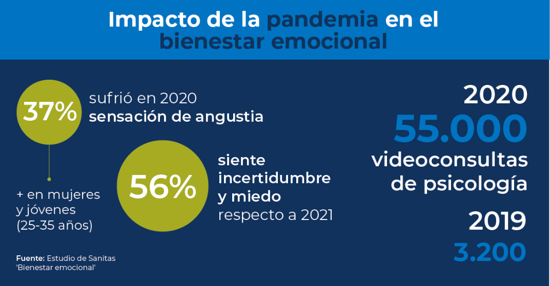 El Estudio Sanitas bienestar emocional refleja que un 37% de los españoles sufrió el pasado año sensación de angustia e incertidumbre, algo que fue más significativo en mujeres y jóvenes de edades comprendidas entre los 25 y 35 años. Además, para el 56% de la población las perspectivas sobre el desarrollo del año 2021 son en su mayoría de incertidumbre y miedo porque no se cumplan los propósitos marcados, así como de apatía, actitudes que manifiestan en mayor medida las mujeres por encima de los hombres.