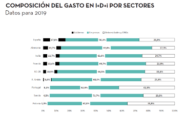 Desglosando por sectores el gasto, se advierte que tanto las empresas como las Universidades y ONGs, gastan más que los gobiernos en I+D+i.