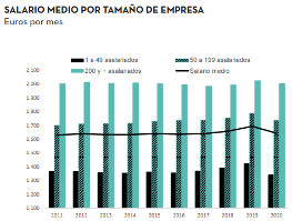 Dado que los salarios dependen, en última instancia, de la productividad del trabajo, es un hecho estructural que el nivel de las remuneraciones tiende a ser más alto cuanto mayor es el tamaño de las empresas. Mientras el salario medio bruto de las empresas con al menos 200 asalariados se mantuvo por encima de los 2.000 euros mensuales en 2020, el de aquellas con menos de 50 asalariados fue de 1.340 euros.