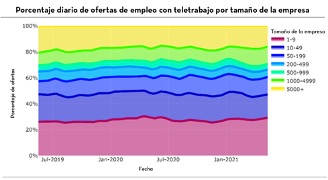 Durante la pandemia, empresas de todos los tamaños se inclinaron hacia el trabajo a distancia para cumplir con las medidas de seguridad y mantener a sus empleados a salvo. En mayo de 2021, más del 40% de las ofertas de empleo que hacían referencia al teletrabajo se llevaron a cabo por empresas con menos de 50 empleados. Además, la tendencia en el crecimiento del trabajo remoto fue notablemente consistente en organizaciones de diferentes tamaños.