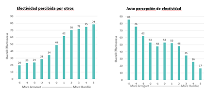 2.- Humildad: ¿cuándo actuamos con humildad? cuando reconocemos nuestros puntos fuertes y capacidades sin alardear de ello, cuando aceptamos nuestros errores y los de los demás, cuando aceptamos nuestras limitaciones. Actuando con humildad estamos mucho más abiertos al aprendizaje. Zenger Folkman señalan la tremenda paradoja de cómo afecta la humildad-arrogancia en la efectividad como líder, y sus diferencias entre la percepción de otros y la auto percepción. En la gráfica adjunta podemos ver cómo los líderes humildes se auto perciben con menor efectividad, pero son percibidos por los demás evaluadores como mucho más efectivos que los líderes con alta arrogancia.