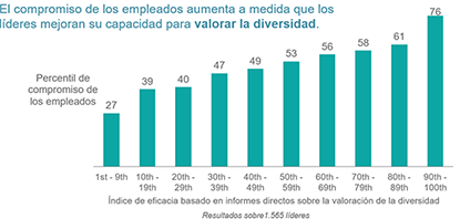 Como podemos ver en la gráfica adjunta, los managers que gestionan mejor la diversidad consiguen 55% más compromiso de sus colaboradores que los promedio, y casi 3 veces más que los más ineficaces en este comportamiento.